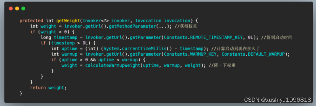 逻辑很简单,我们再来看一下计算权重的方法,这是个公共逻辑,其实是为了服务预热,我们知道缓存有预热,JIT 也有预热,反应到服务上就是服务需要预热。