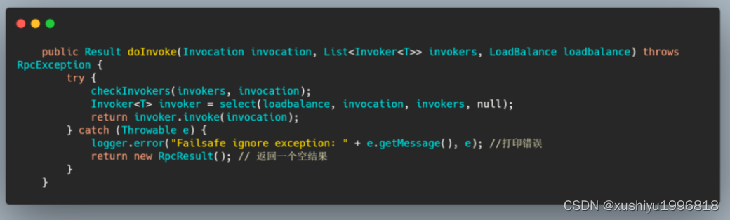 当调用出错的时候就返回空结果,并且加入到 failed 中,并且会有一个定时任务会定时的去调用 failed里面的调用,如果调用成功就从 failed 中移除这个调用。