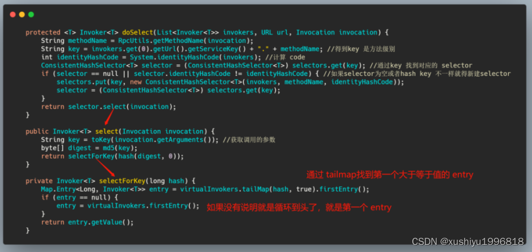 整体的实现也不难,就是上面所说的那个逻辑,而圆环这是利用 treeMap 来实现的,通过 tailMap 来查找大于等于的第一个 invoker,如果没找到说明要拿第一个,直接赋值 treeMap 的 firstEntry。