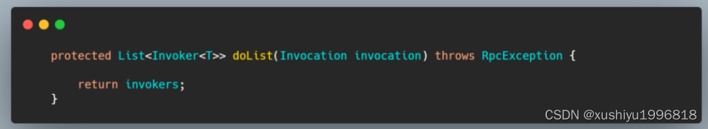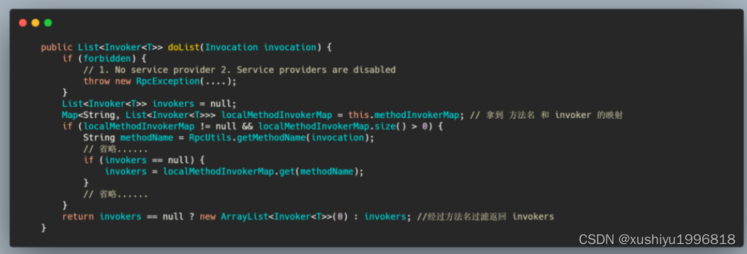 获取 invoker 列表,RegistryDirectory 实现的父类抽象方法 doList,其目的就是得到 invoker 列表,而其内部的实现主要是做了层方法名的过滤,通过方法名找到对应的 invokers。