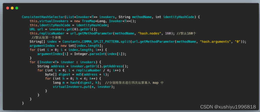 先来看下一致性 hash 的实现,这个 virtualInvokers 是 TreeMap。