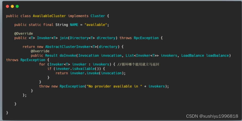 这其实是它们的父类,不过 AvailableCluster 内部就是返回 AbstractClusterInvoker,这个主要用在多注册中心的时候,比较简单,就是哪个能用就用那个。