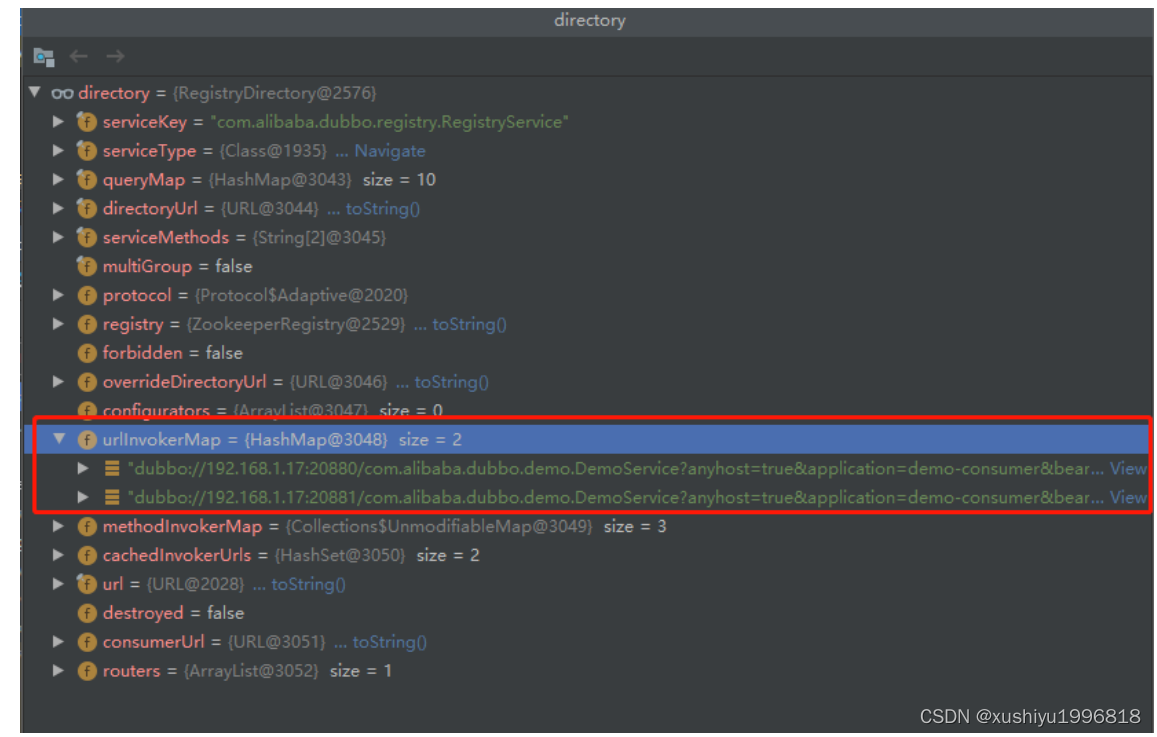 从截图可以看到 RegistryDirectory 内部存储了 DemoService 的两个服务提供者 url 和对应的 invoker。