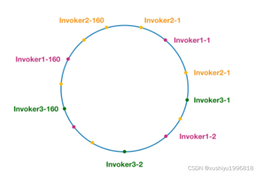 然后 Dubbo 默认搞了 160 个虚拟节点,整体的 hash 是方法级别的,即一个 service 的每个方法有一个 ConsistentHashSelector,并且是根据参数值来进行 hash的,也就是说负载均衡逻辑只受参数值影响,具有相同参数值的请求将会被分配给同一个服务提供者。