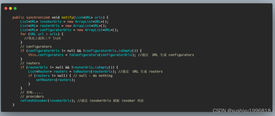 RegistryDirectory 定义了三种集合,分别是 invokerUrls 、routerUrls 、configuratorUrls 分别处理相应的配置变化,然后对应转化成对象。