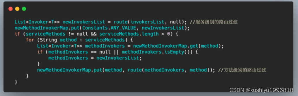 路由的配置一样是通过 RegistryDirectory 的 notify 更新和构造的,然后路由的调用在是刷新 invoker 的时候,具体是在调用 toMethodInvokers 的时候会进行服务级别的路由和方法级别的路由。