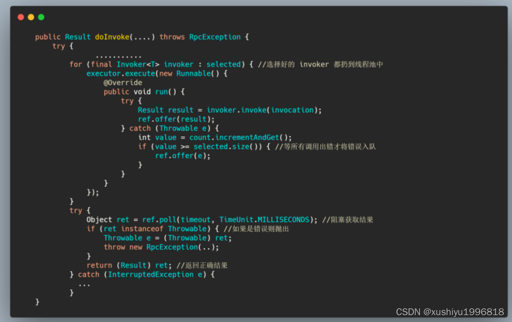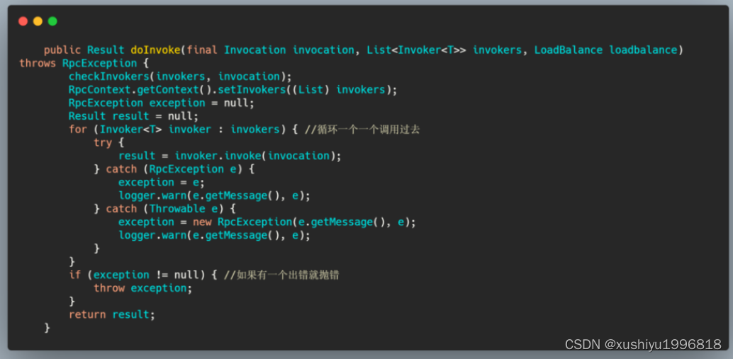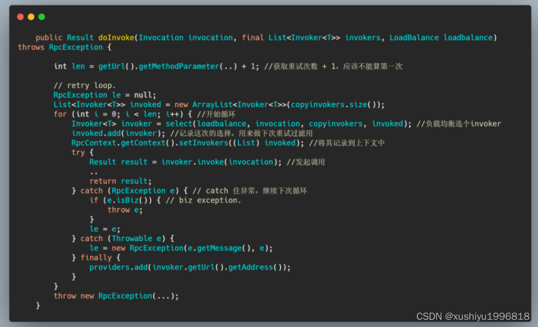 每次循环会通过负载均衡选择一个 Invoker,然后通过这个 Invoker 进行远程调用,如果失败了会记录下异常,并进行重试。