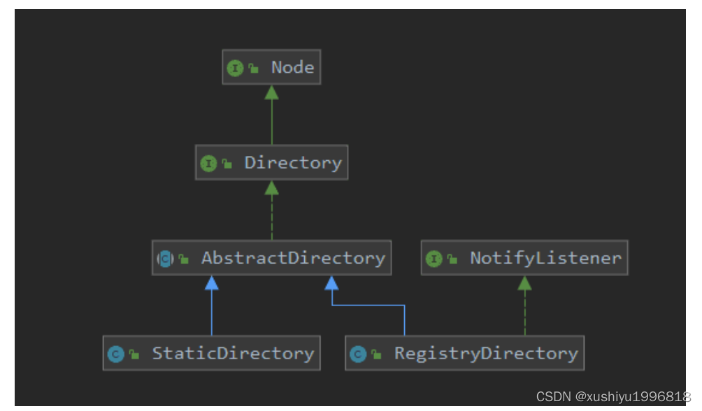 这个 Node 就不管了,主要是看 Directory ,正常操作搞一个抽象类来实现 Directory 接口,抽象类会实现一些公共方法,并且定义好逻辑,然后具体的实现由子类来完成,可以看到有两个子类,分别是 StaticDirectory 和 RegistryDirectory。