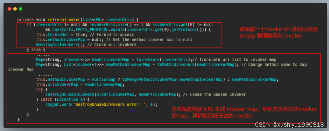 刷新 Invoker 列表,其实就是根据监听变更的 invokerUrls 做一波操作,refreshInvoker(invokerUrls), 根据配置更新 invokers。