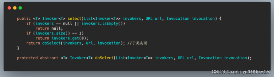 这些实现类都继承于这个类,该类实现了 LoadBalance 接口,并封装了一些公共的逻辑,同样还是模板方法,熟悉的配方。