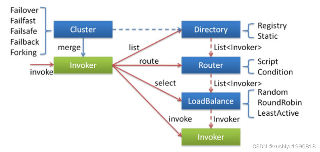 假设选择的那个 invoker 调用出错了怎么办?前面我们已经提到了,这时候就是 cluster 登场的时候了,它会把这一堆 invoker 封装成 clusterInovker,给到消费者调用的就只有一个 invoker 了,