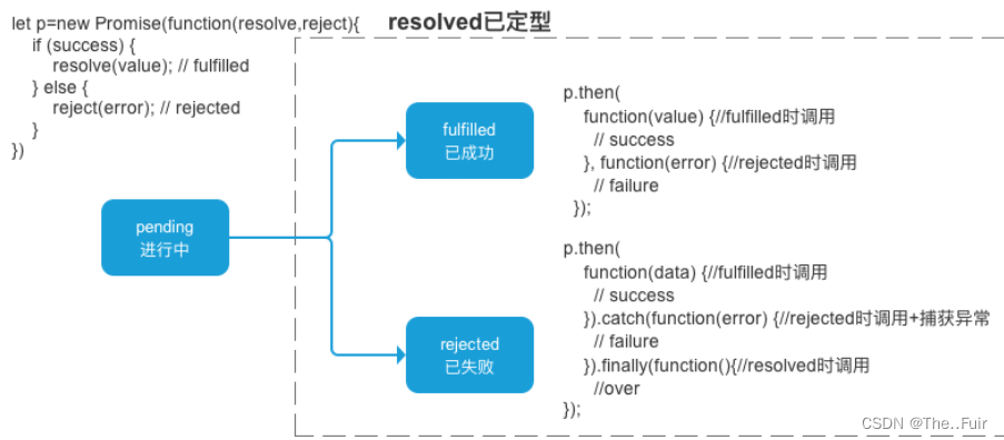 当状态由pending变为fulfilled的时候执行该回调函数, 参数: 最多需要有两个参数,Promise 的成功和失败情况的回调函数。 返回值: 返回一个新的Promise实例对象,因此可以使用链式调用。