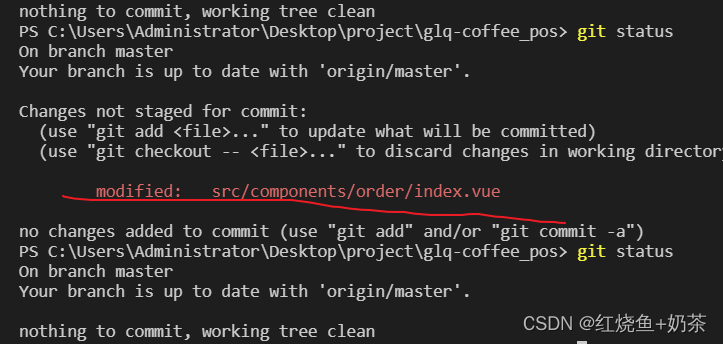 => 修改代码后 =>git pull(拉取最新的代码并合并,相当于git fetch + git merge,若为最新代码则不需要)=> git add . (添加到暂存区) => git commit -m ' 修复...'(添加到历史区)=> git push (或者 git push origin + 分支 提交代码)