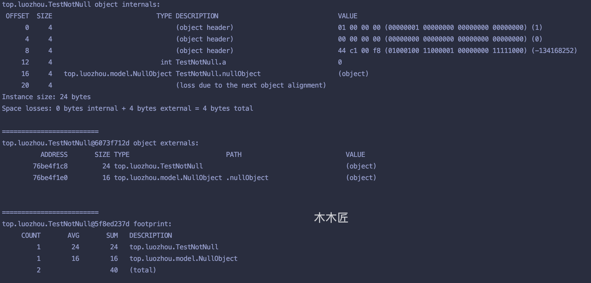 我们可以看到TestNotNull的类占用空间是24字节,其中头部占用12字节,变量a是int类型,占用4字节,变量nullObject是引用,占用了4字节,最后填充了4个字节,总共是24个字节,与我们之前的预测一致。但是,因为我们实例化了NullObject,这个对象一会存在于内存中,所以我们还需要加上这个对象的内存占用16字节,那总共就是24bytes+16bytes=40bytes。我们图中最后的统计打印结果也是40字节,所以我们的分析正确。