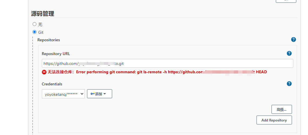 配置仓库地址,出现无法连接仓库的情况:Error performing git command: git ls-remote -h
