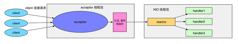 acceptor :也可以理解为一个Handler,这个Handler只负责创建具体处理IO请求的Handler(负责所有client的连接请求),如果Reactor广播时SelectionKey创建一个Handler负责绑定相应的SocketChannel到Selector中。下次再次有IO事件时会调用对应的Handler去处理