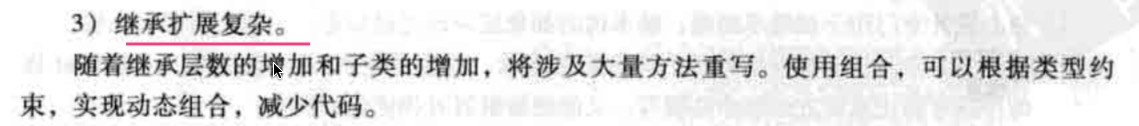 随着继承层数的增加和子类的增加,将涉及大量方法重写。使用组合,可以根据类型约束,实现动态组合,减少代码。