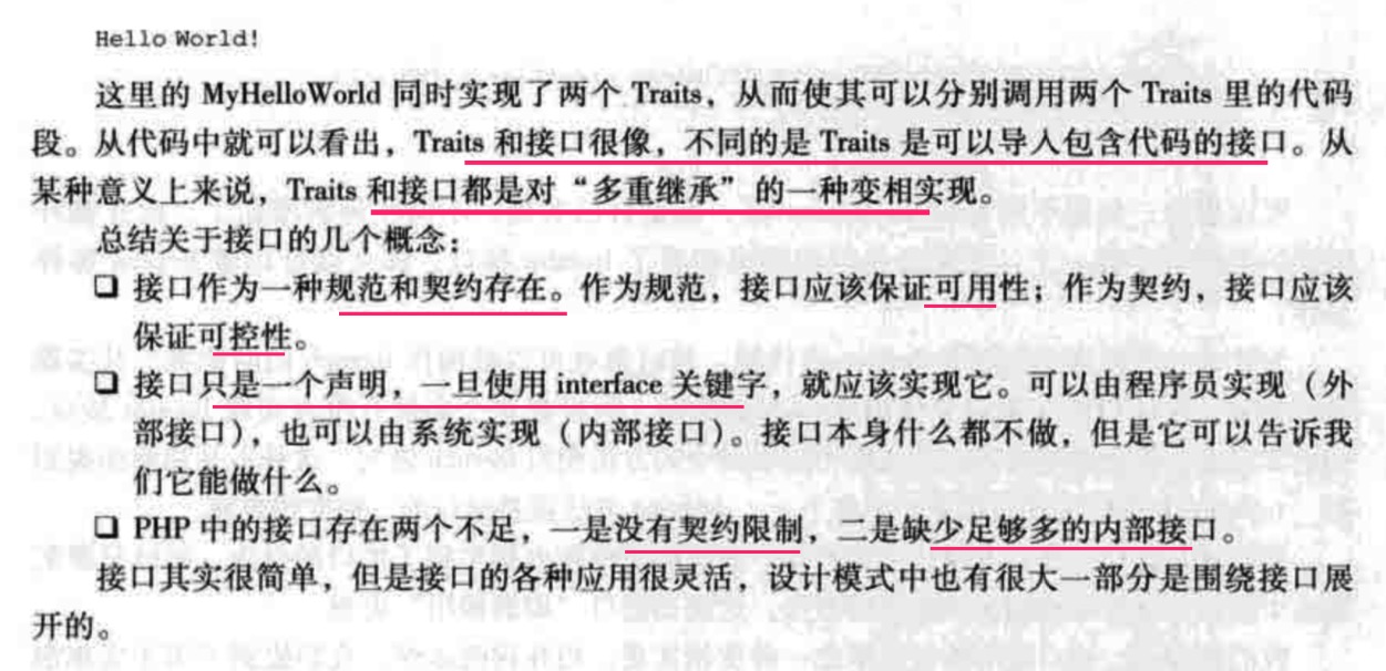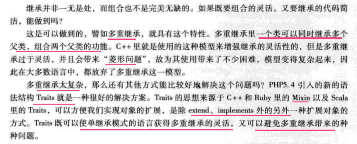 接口是对多重继承的一种变相实现,trait 可以被视为一种加强型接口。