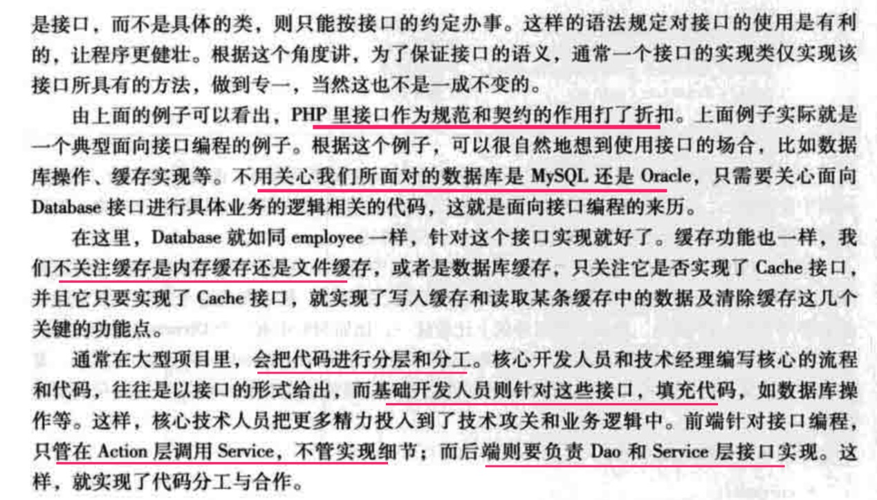 大型项目中,核心开发人员和技术经理编写核心的流程和代码,以接口形式给出。而基础开发人员,指针对这些接口,填充代码,如数据库操作等。这样,