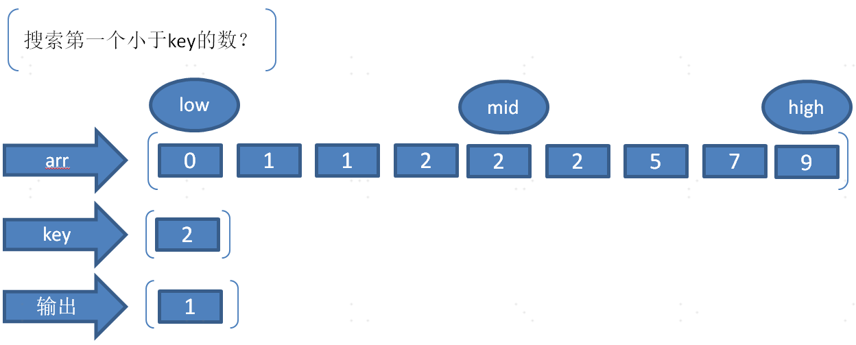 // 需要先找到和key相同的数,比key小的数就是从mid往low方向找