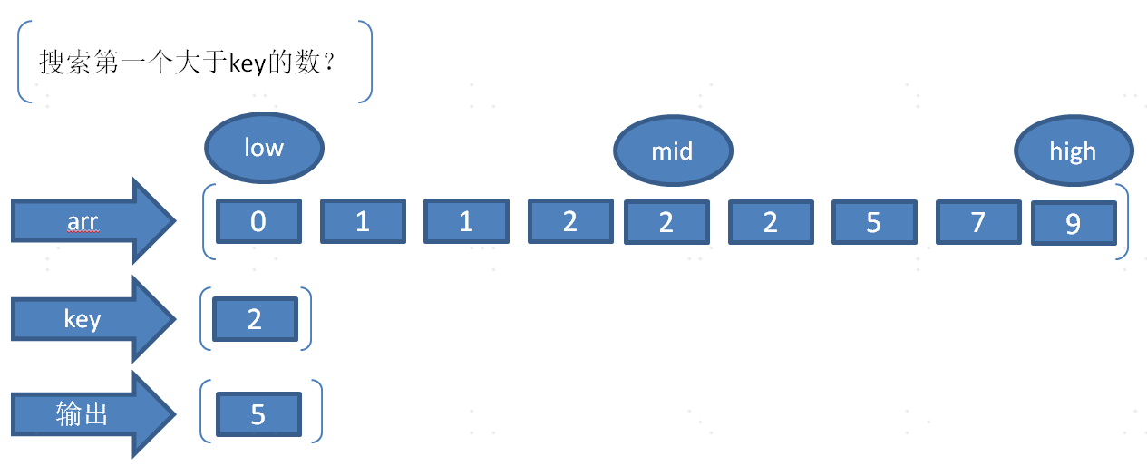 // 需要先找到和key相同的数,比key大的数就是从mid往high方向找