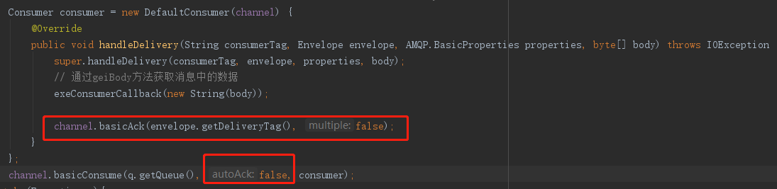 Consume: 消息的消费者,使用频道(Channel)订阅消息队列(Queue),在handleDelicery方法中处理。