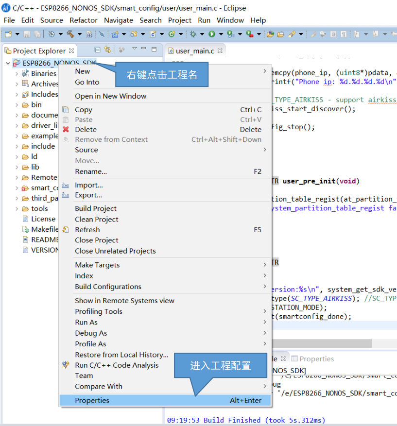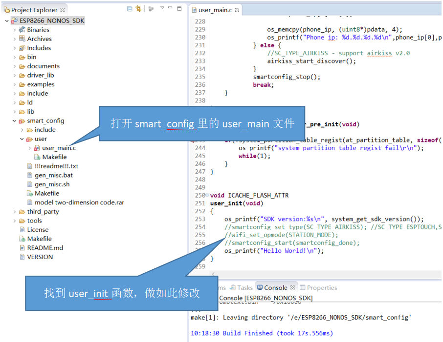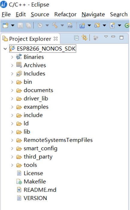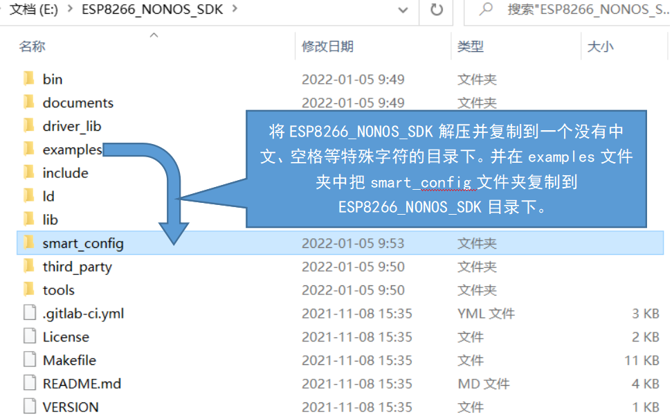 将ESP8266_NONOS_SDK解压并复制到一个没有中文、空格等特殊字符的目录下。并在examples文件夹中把smart_config文件夹复制到ESP8266_NONOS_SDK目录下。