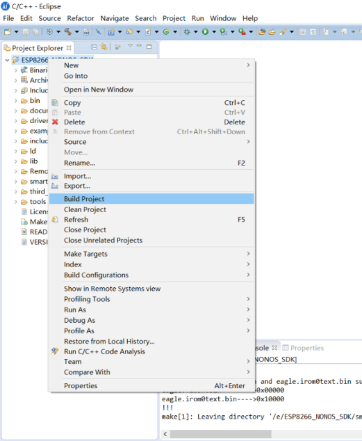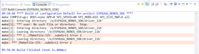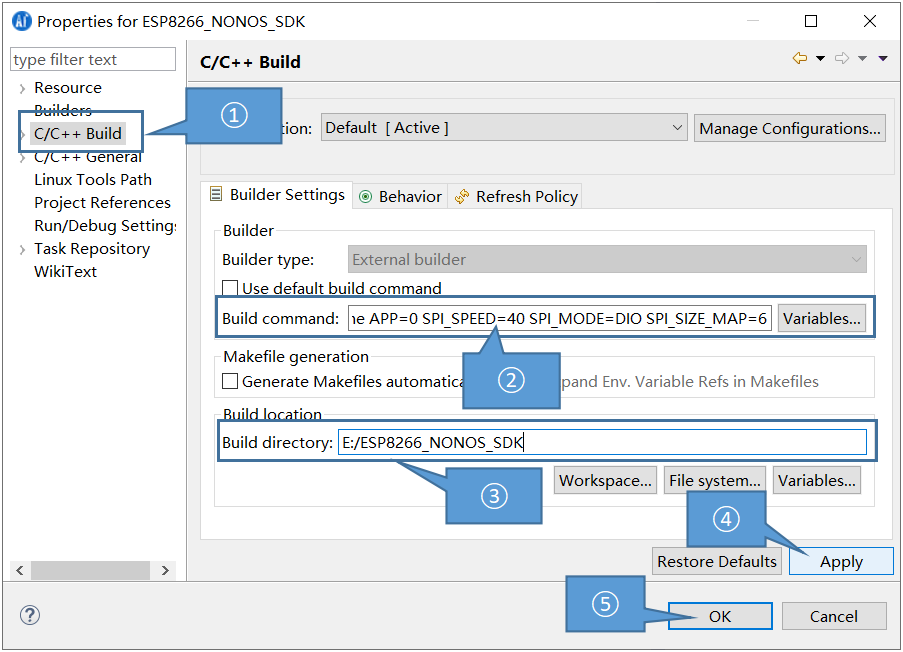 选择C/C++ Build → Build command中添加编译规则,用户可以根据实际情况来更改规则【make COMPILE=gcc BOOT=none APP=0 SPI_SPEED=40 SPI_MODE=DIO SPI_SIZE_MAP=6】。