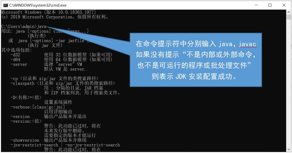 2)在命令提示符中分别输入java,javac如果没有提示“不是内部或外部命令,也不是可运行的程序或批处理文件”则表示JDK安装配置成功。