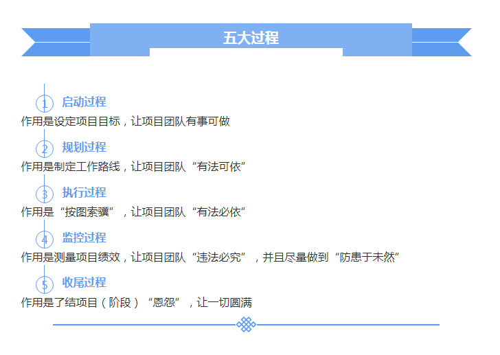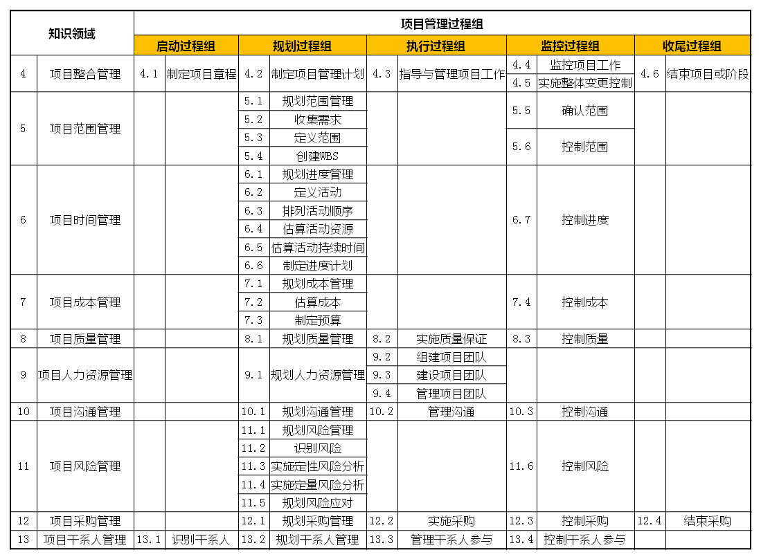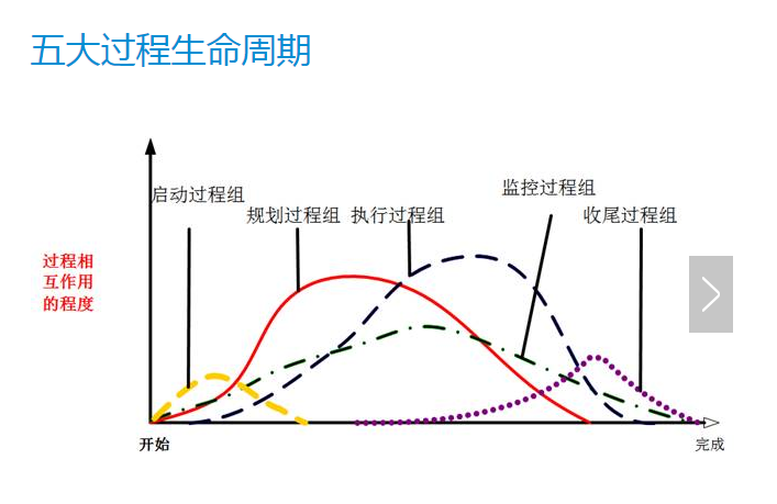 5、收尾过程组:为完结所有过程组的所有活动以正式结束项目或阶段而实施的一组过程。