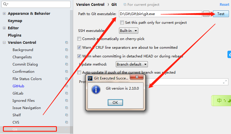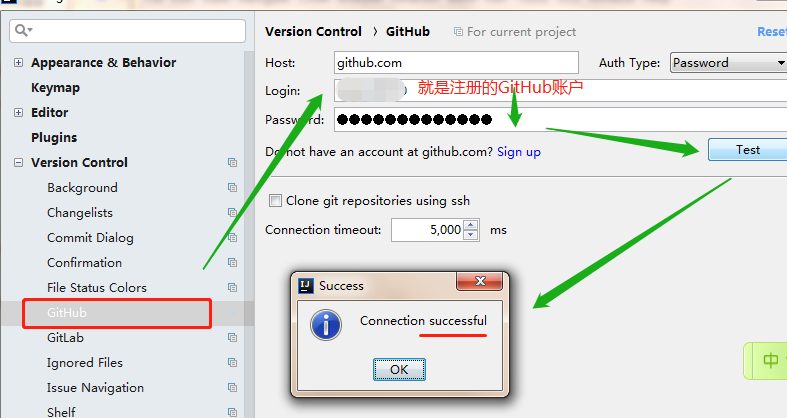 2.分别在Login与Password中输入自己在Github注册的用户名和密码,然后点击Test按钮:
