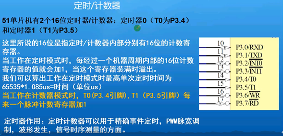 它内部有一个16位的定时计数器,如果我们把它设定在定时模式下,每隔一个机械周期这个16位寄存器就会加1,当他们一直加加满的时候(65535)他就会溢出,这个时候单片机就会自动的把TF这一位变成1. 加满了我们通常认为是定时时间到。给他一个初值然后判断需要定时的时间。可以把16的定时计数器放一个初值,让他从这个初值上面加。加满以后TF位会变为1.