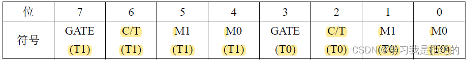 C/T: 定时器或计数器选择位。该位被清零时用作定时器功能(内部系统时钟),被置 1 用作计数器功能。