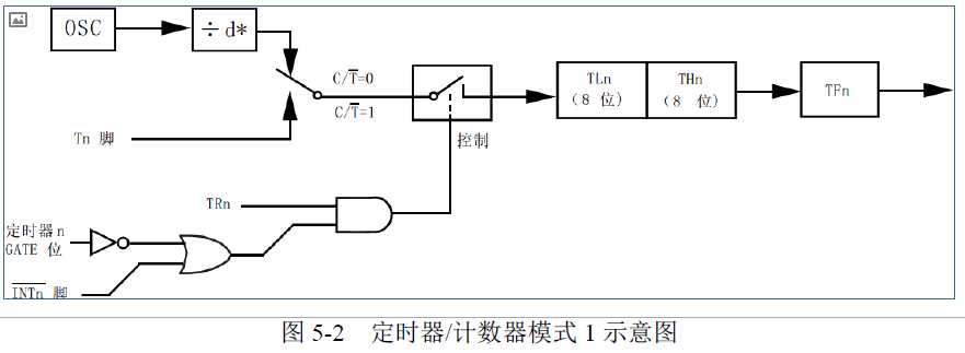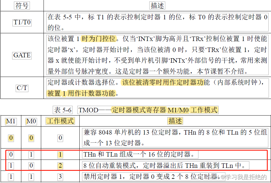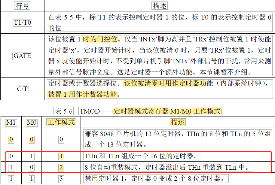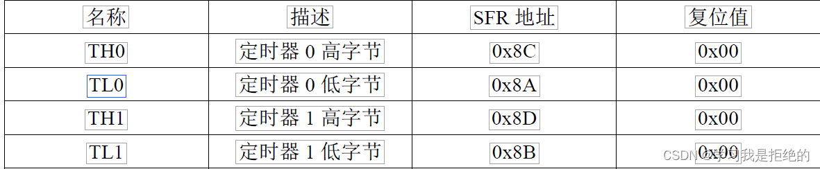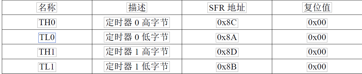 表 5-1 的寄存器是存储定时器的计数值的。TH0/TL0 用于 T0,TH1/TL1 用于 T1。