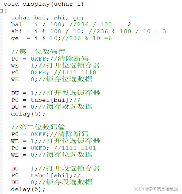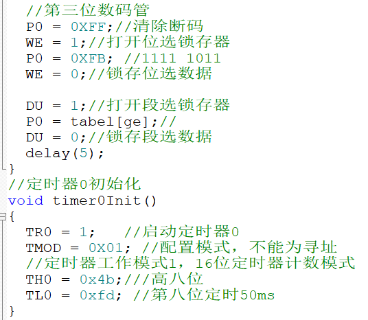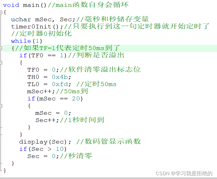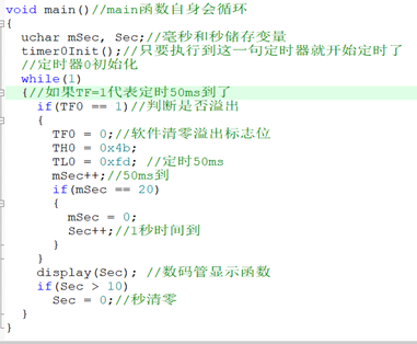 先判断是否溢出了也就是TF0=1代表定时了50ms,然后循环mSec++,加一次是50ms,当加到20次的时候正好是1s