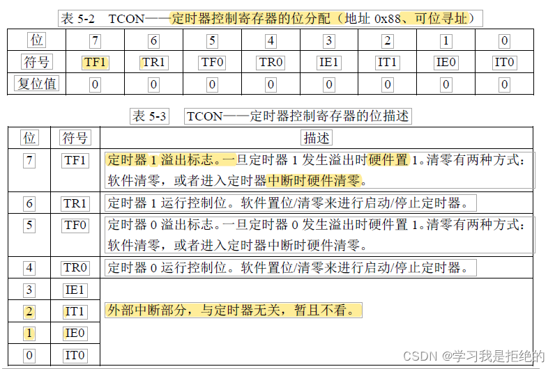 表 5-2 是定时器控制寄存器 TCON 的位分配,表 5-3 是则是对每一位的具体含义的描述。