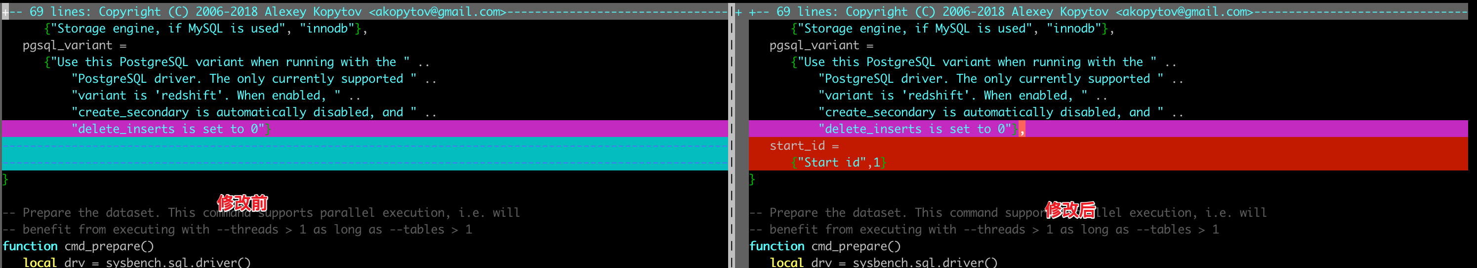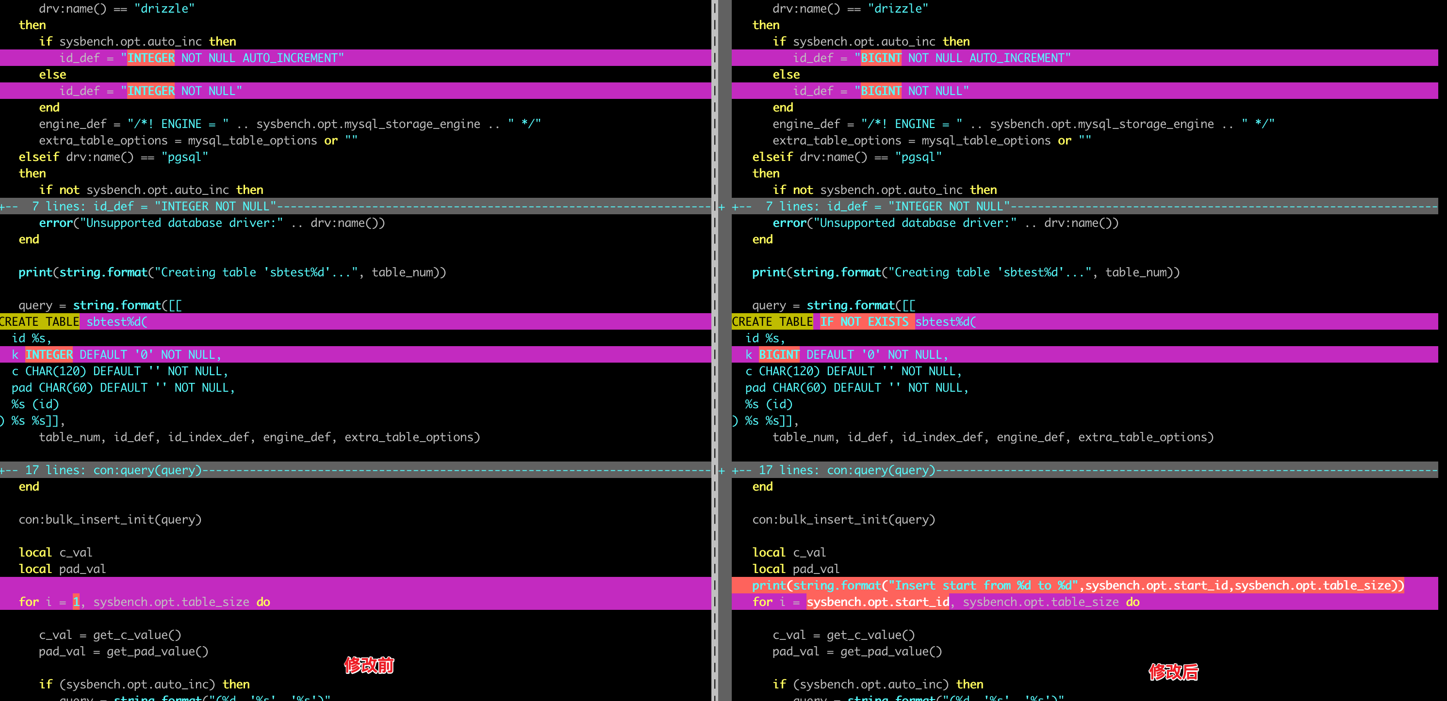要实现同时启动多个 sysbench 程序同时写入,通过直接修改代码写入数值的方式就比较麻烦,并且 lua 是脚本语言,在前面 sysbench 运行过程中,修改 lua 脚本,可能会导致不预期的行为。所以考虑通过命令行参数的方式将起始值和结束值传入。