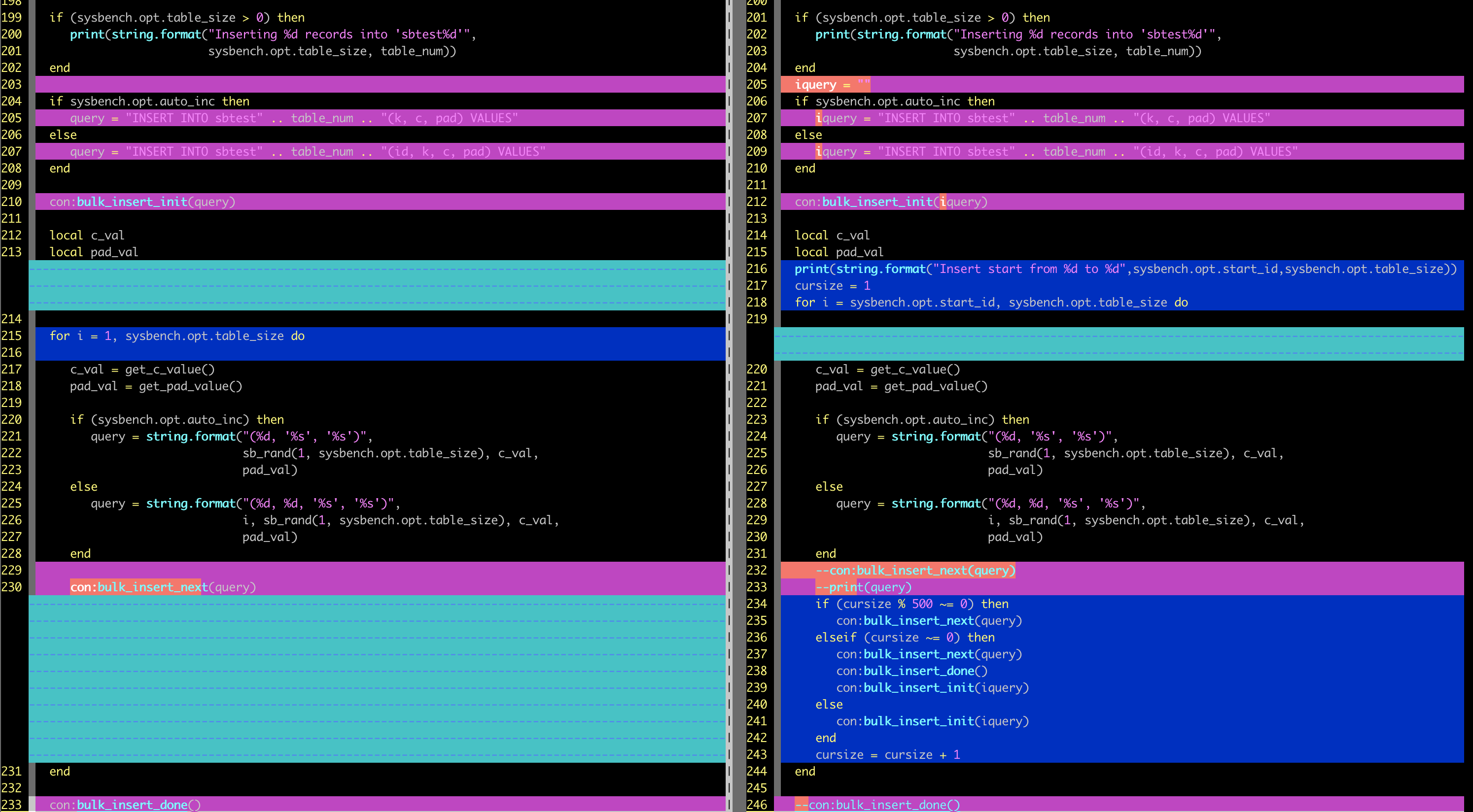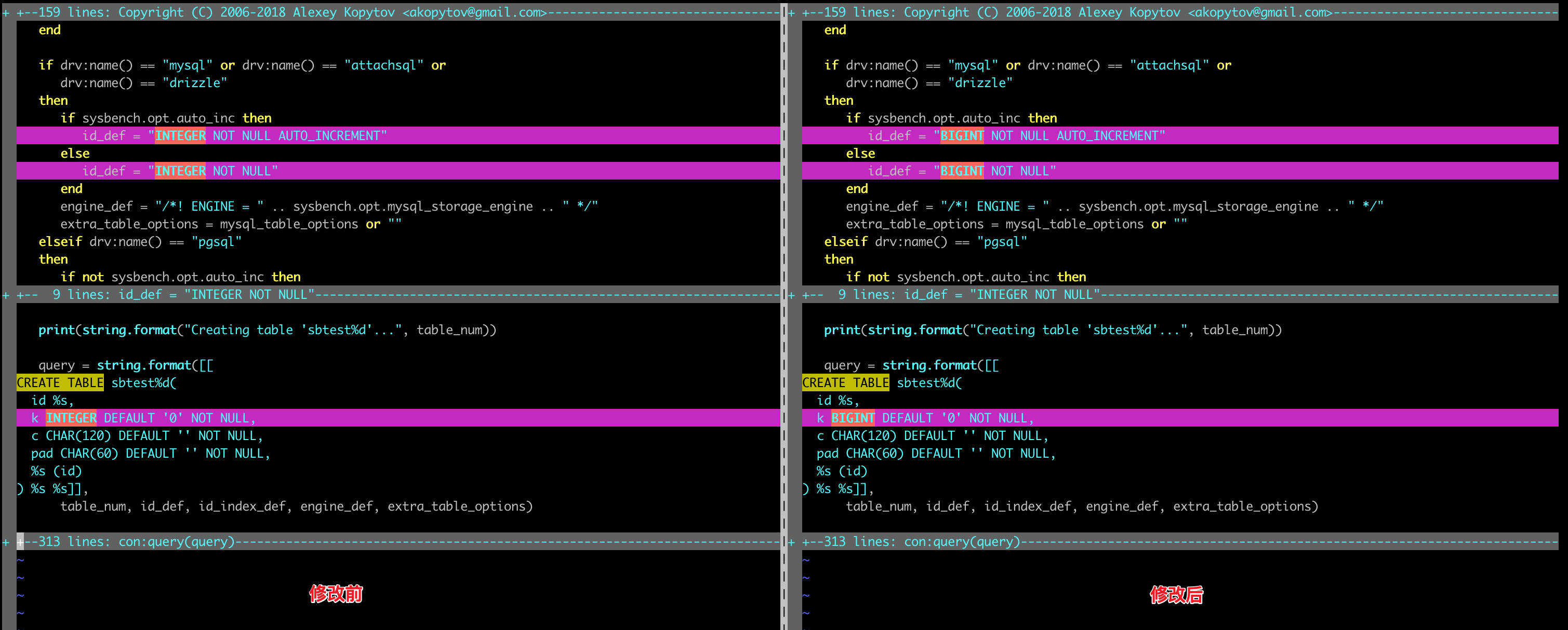 但是这种修改方式主要是针对单表造数的情况,如果有多张表的造数,sysbench 遇到错误中断退出后,每个表的 max(id) 值可能是不同的,如果对数据数量以及准确度要求完全跟原生 sysbench 产生的一样,可以将 INSERT 语句修改为 REPLACE 语句,并且 for 循环起始位置取多张表的 max(id) 中的最小值来完成。