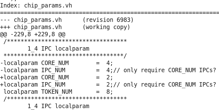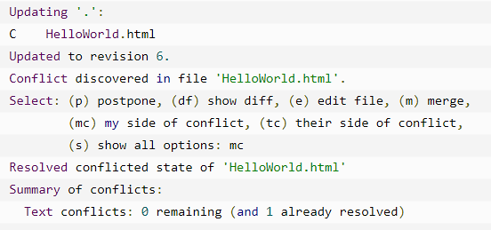 上图中给出了chip_params.vh文件在本地和服务器的不同,revision是版本号,working copy是本地副本,同时给出了具体不同的位置。当本地文件和服务器冲突时,使用svn update命令可能会导致系统提示代码冲突,并让你选择如何处理冲突,例如: