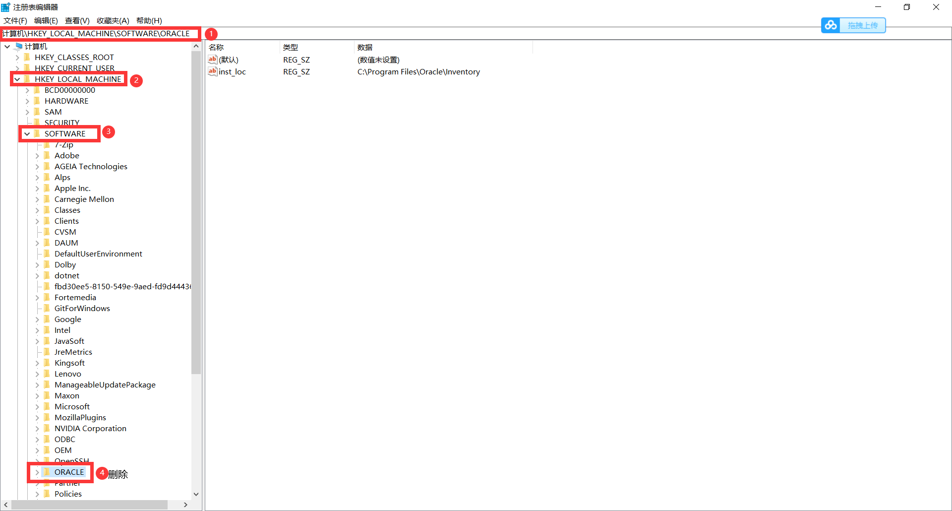 计算机\HKEY_LOCAL_MACHINE\SOFTWARE目录下由Oracle开头的删除