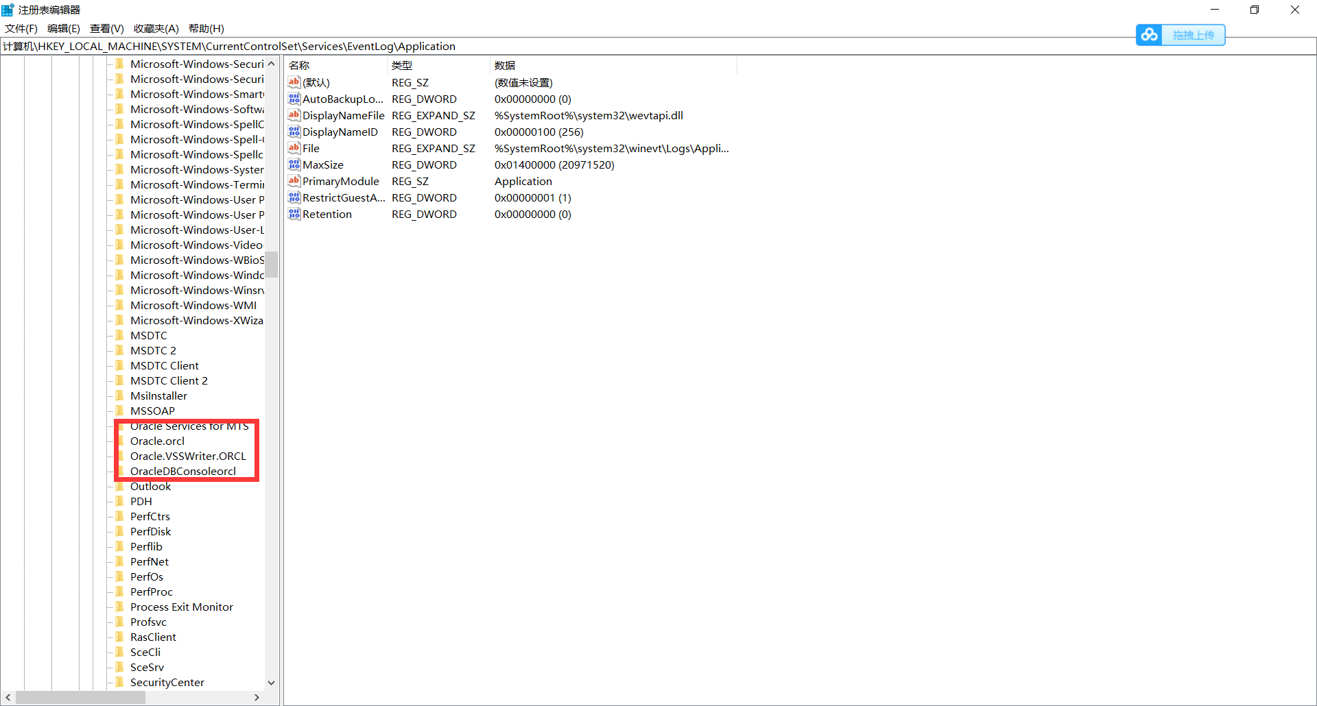 计算机\HKEY_LOCAL_MACHINE\SYSTEM\CurrentControlSet\Services\EventLog\Application目录下由Oracle开头的删除