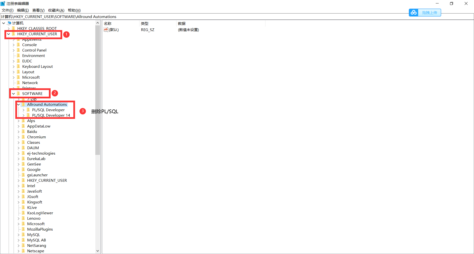 打开注册表,删除计算机\HKEY_CURRENT_USER\SOFTWARE\Allround Automations下的PL/SQL