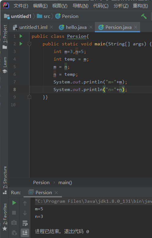 编写代码实现两个变量值交换,int m = 3, n =5;