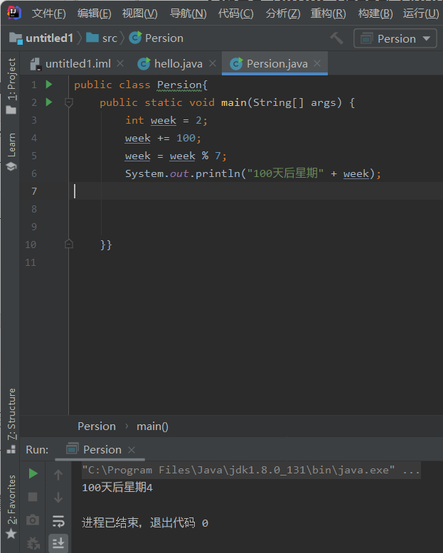 System.out.println("100天后星期" + week);