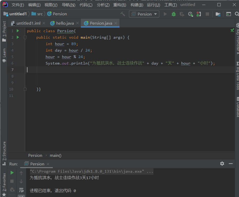 System.out.println("为抵抗洪水,战士连续作战" + day + "天" + hour + "小时");