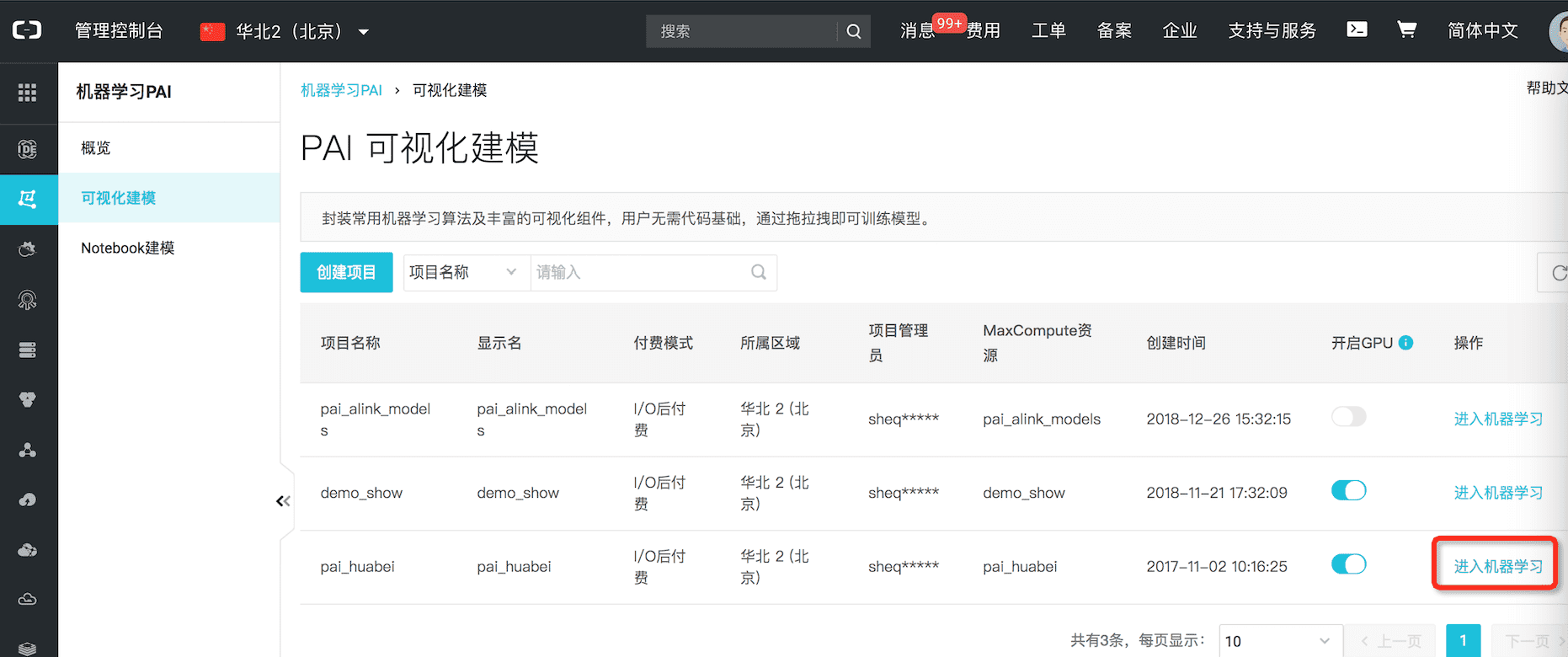 如下图示,在阿里云机器学习平台开通账号之后,进入管理控制台—可视化建模,根据自己的需要新建项目,进入机器学习即可进入到PAI-Studio进行使用。