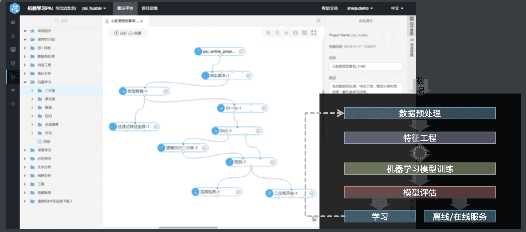 PAI-Studio封装常用机器学习算法及丰富的可视化组件,用户无需代码基础,通过拖拉拽即可训练模型。
