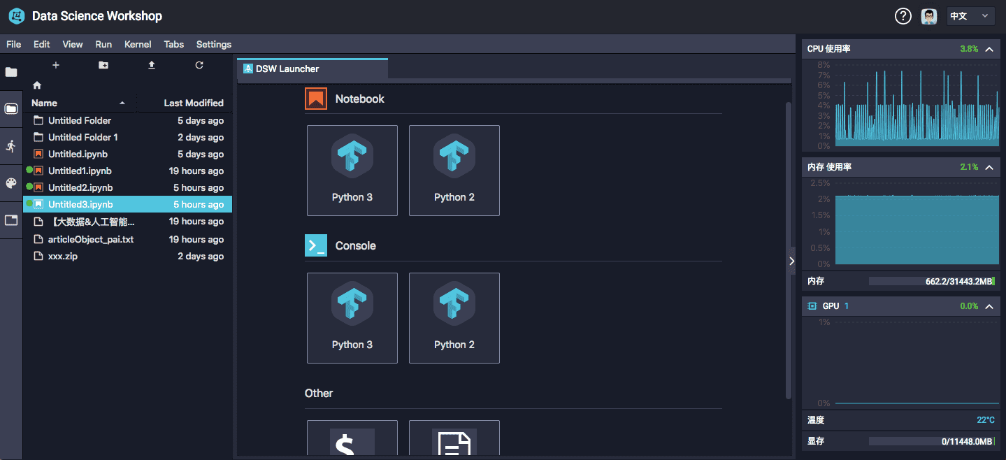 另外一种深度学习解决方案是利用PAI-DSW(Data science workshop),该方案是专门为算法开发者提供的云端深度学习开发环境,详情及使用可参考使用文档。