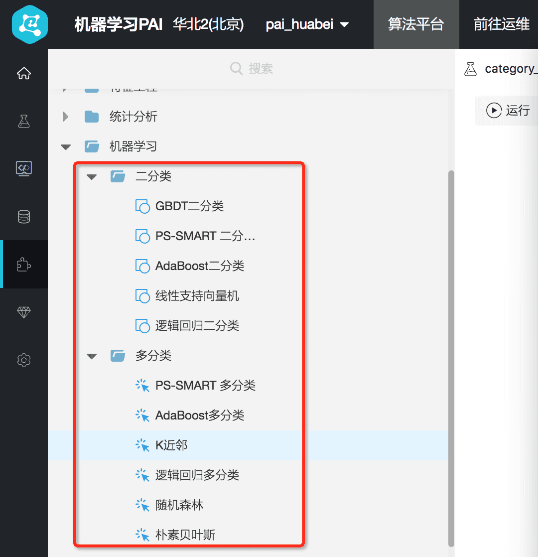 上面依次对常用的分类算法进行了介绍,PAI-Studio中也提供了相应的算法组件,如果想要使用,可以直接拖拽对应组件,配置相关参数即可。