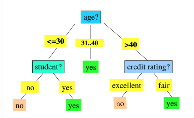 决策树,比较容易理解,以下图为例,根据某个人的特征(年龄、是否学生、信用情况)来进行分类,判断是否可以放贷款给他。生成的决策树如下图示。决策树思想,实际上就是寻找最纯净的划分方法,主要通过决策树的构造和剪枝。